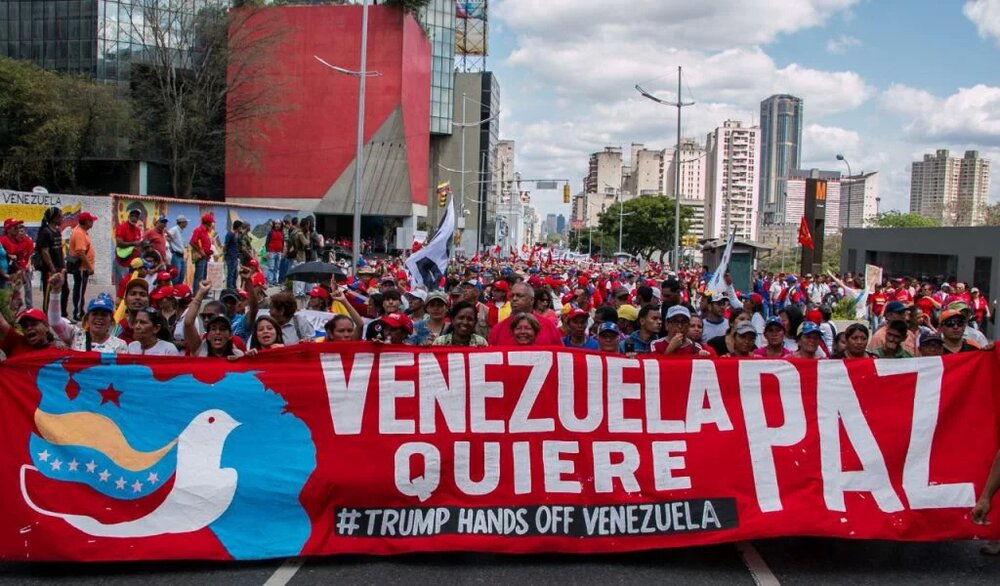 Mobilization in Caracas on March 9 denouncing continued imperialist aggression. Banner reads “Venezuela wants peace”